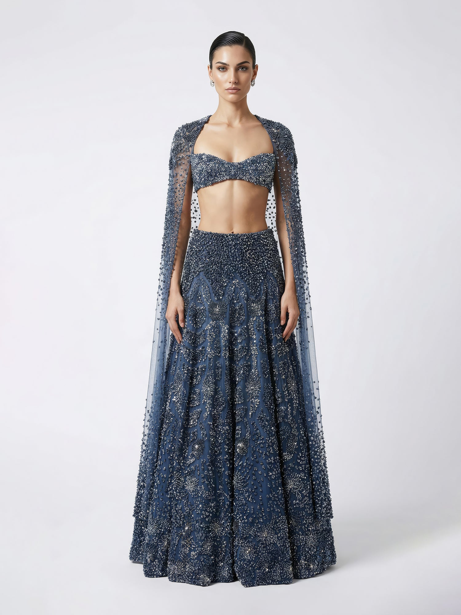 A statement lehenga set adorned with intricate tonal and metallic embellishments, brought to life through 3D floral cluster embroidery. Layered fallen sequins, crystal metallic beads, bugle tubes, and uncut stones create rich texture and depth, offering a refined shimmer with every movement. The lehenga is paired with a structured bandeau top and cape for a contemporary edge.