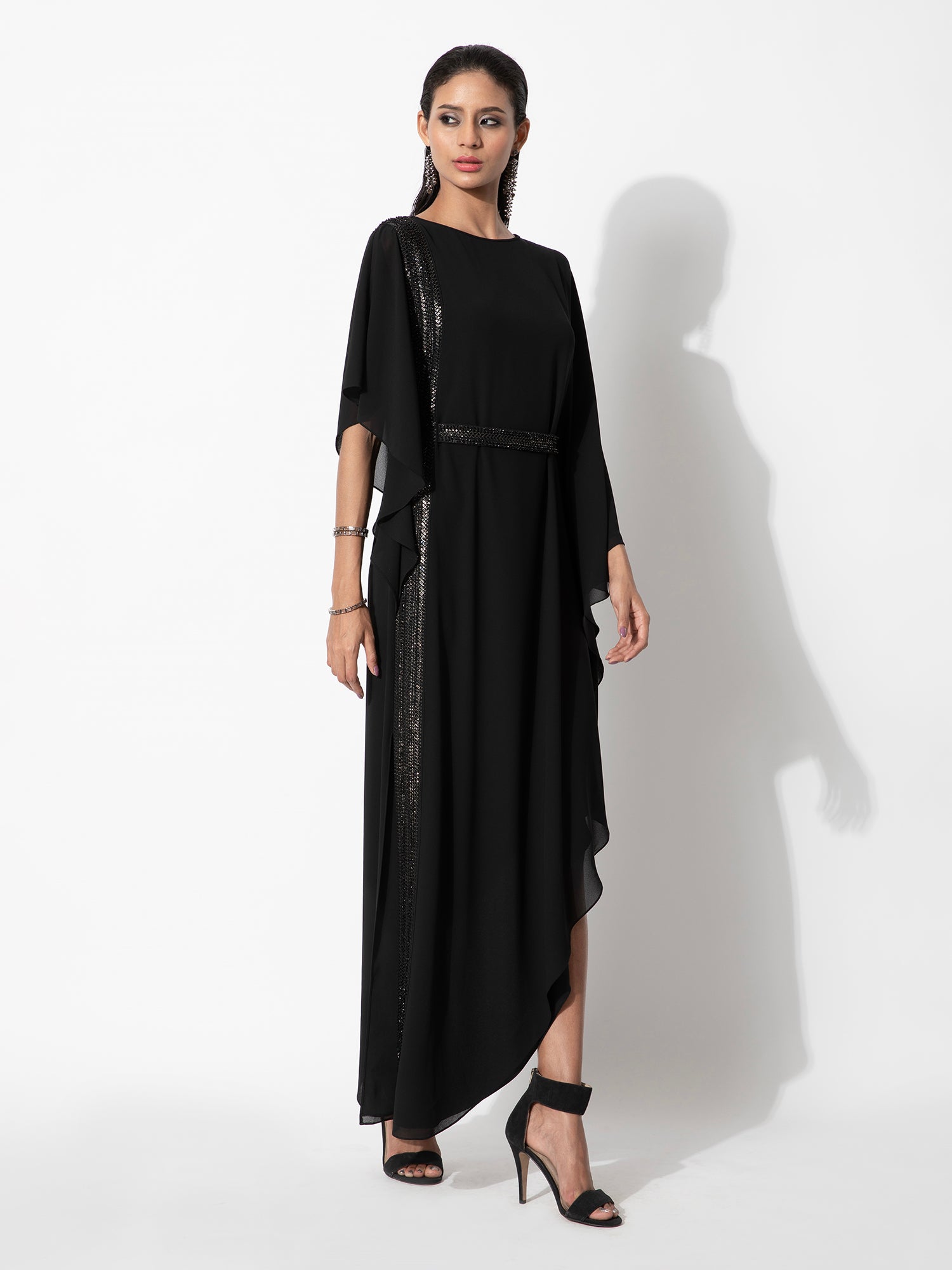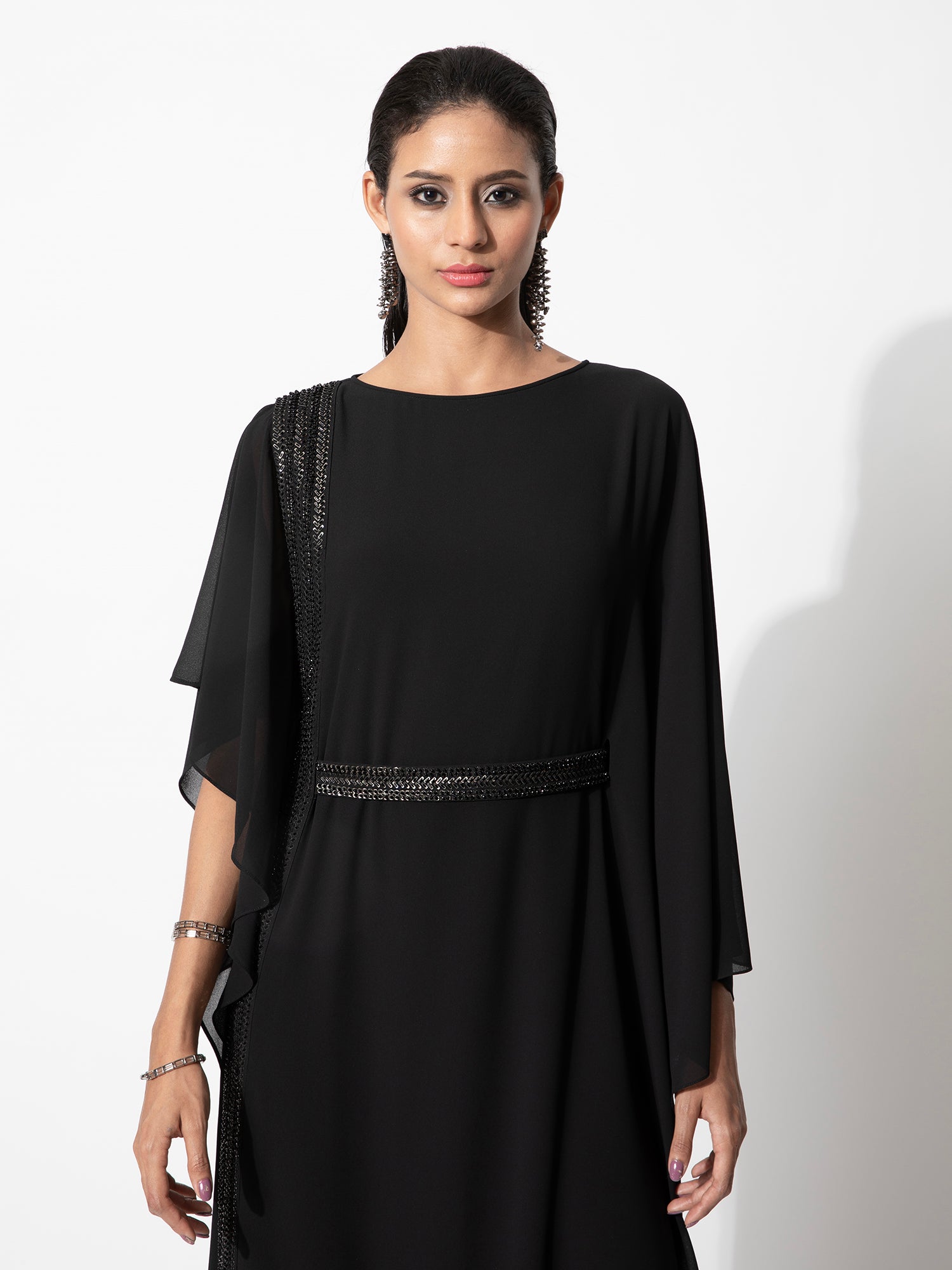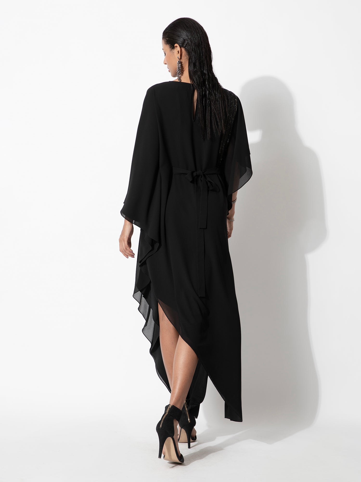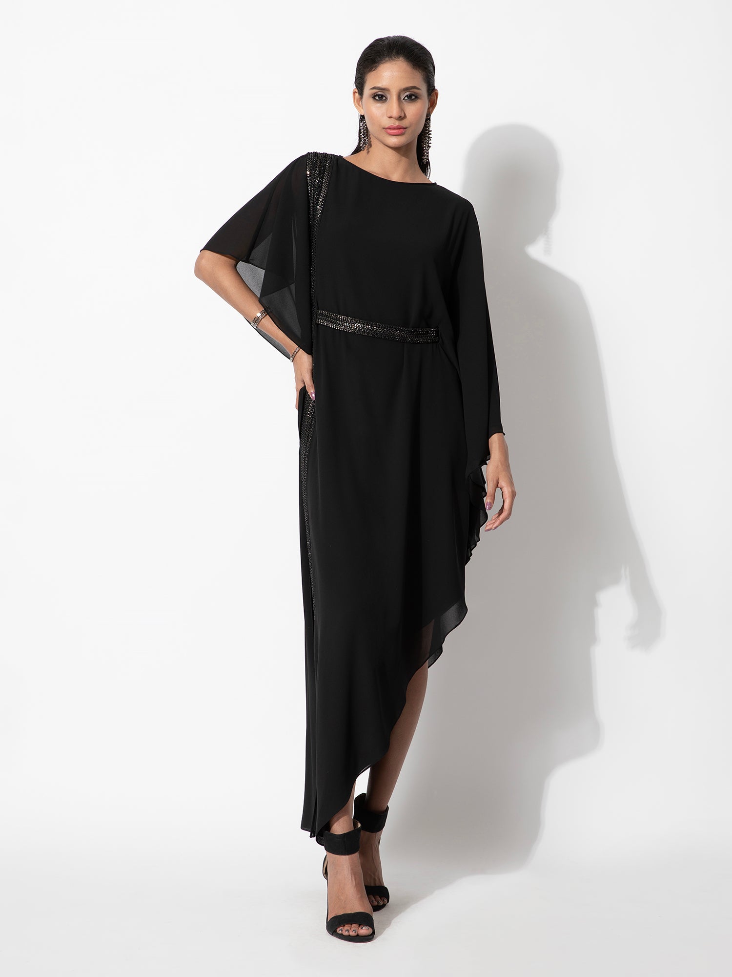 Long Tunic Kaftan with draped asymmetrical sleeves and a side slit featuring embellishments on the belt and side seam.