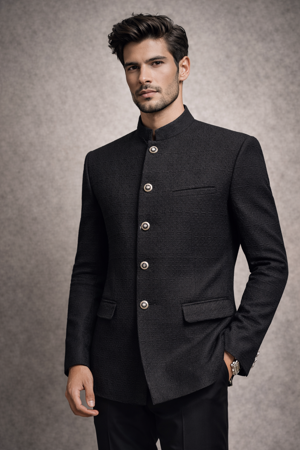 A timeless black bandhgala featuring clean tailoring and a sharp, structured silhouette for formal and celebratory occasions.