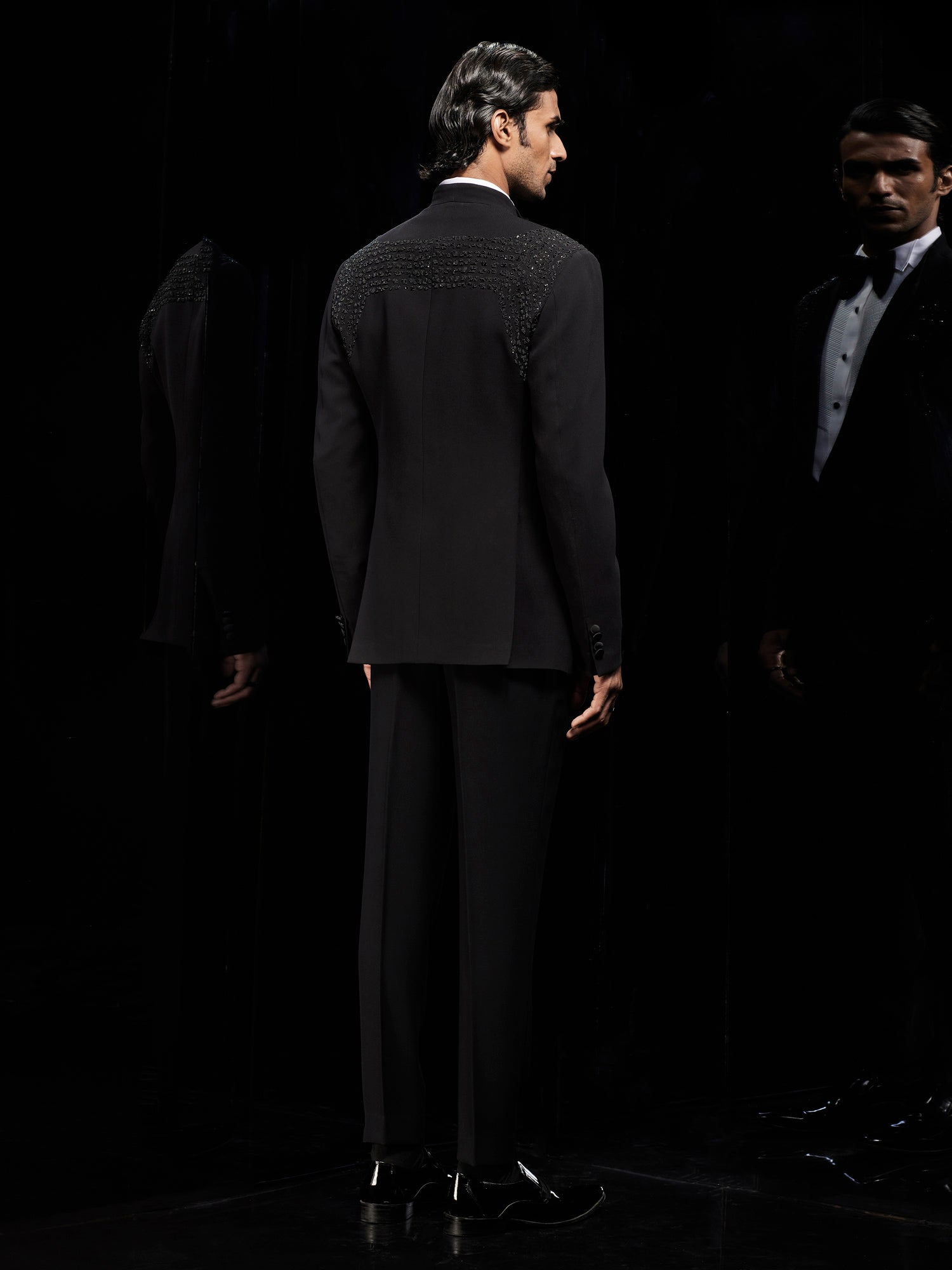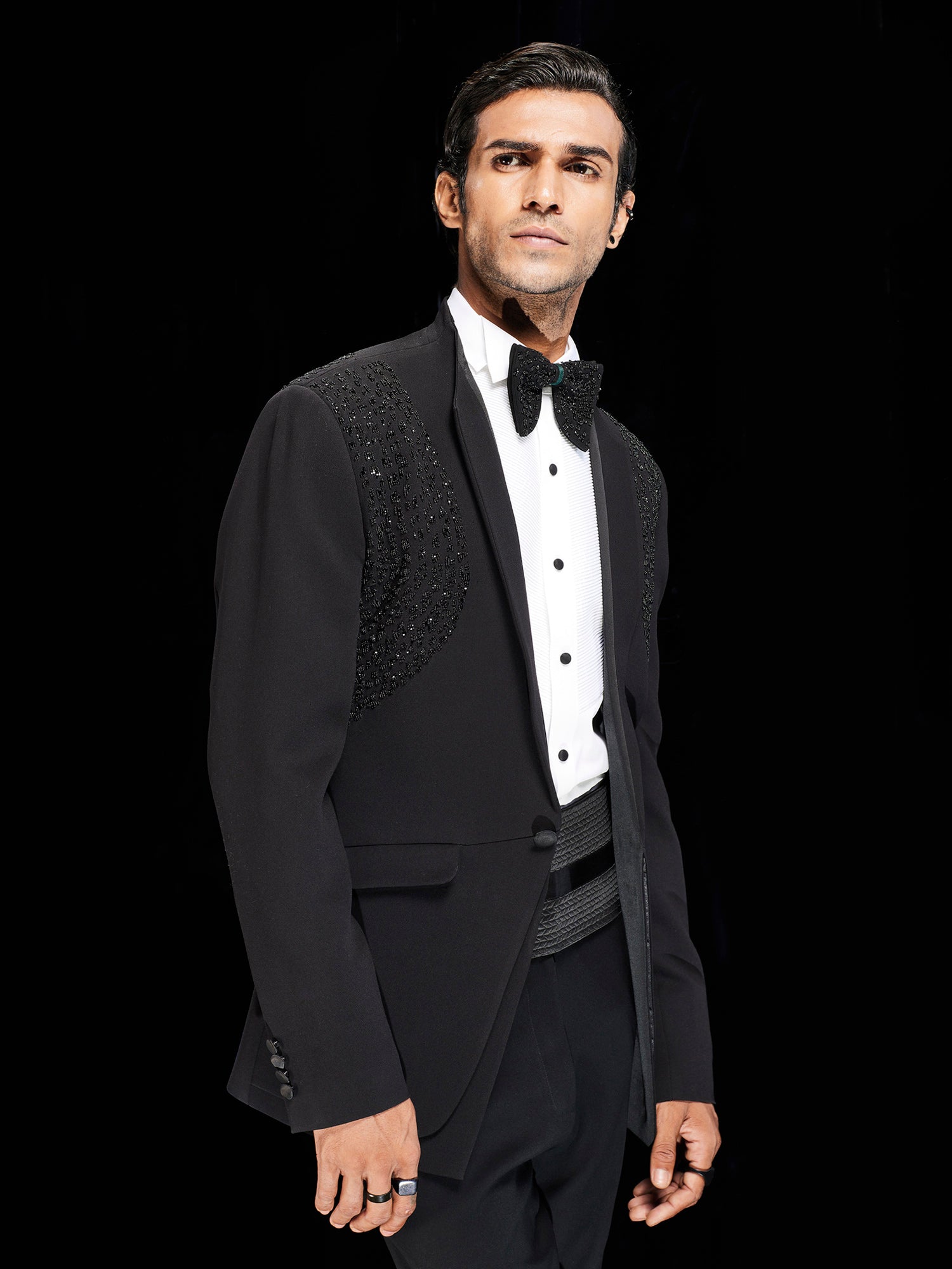 Our Felix layered tuxedo has geometric embellishment around the shoulder. Single-buttoned shawl collar. You can pair this piece with classic black flat-front trousers.