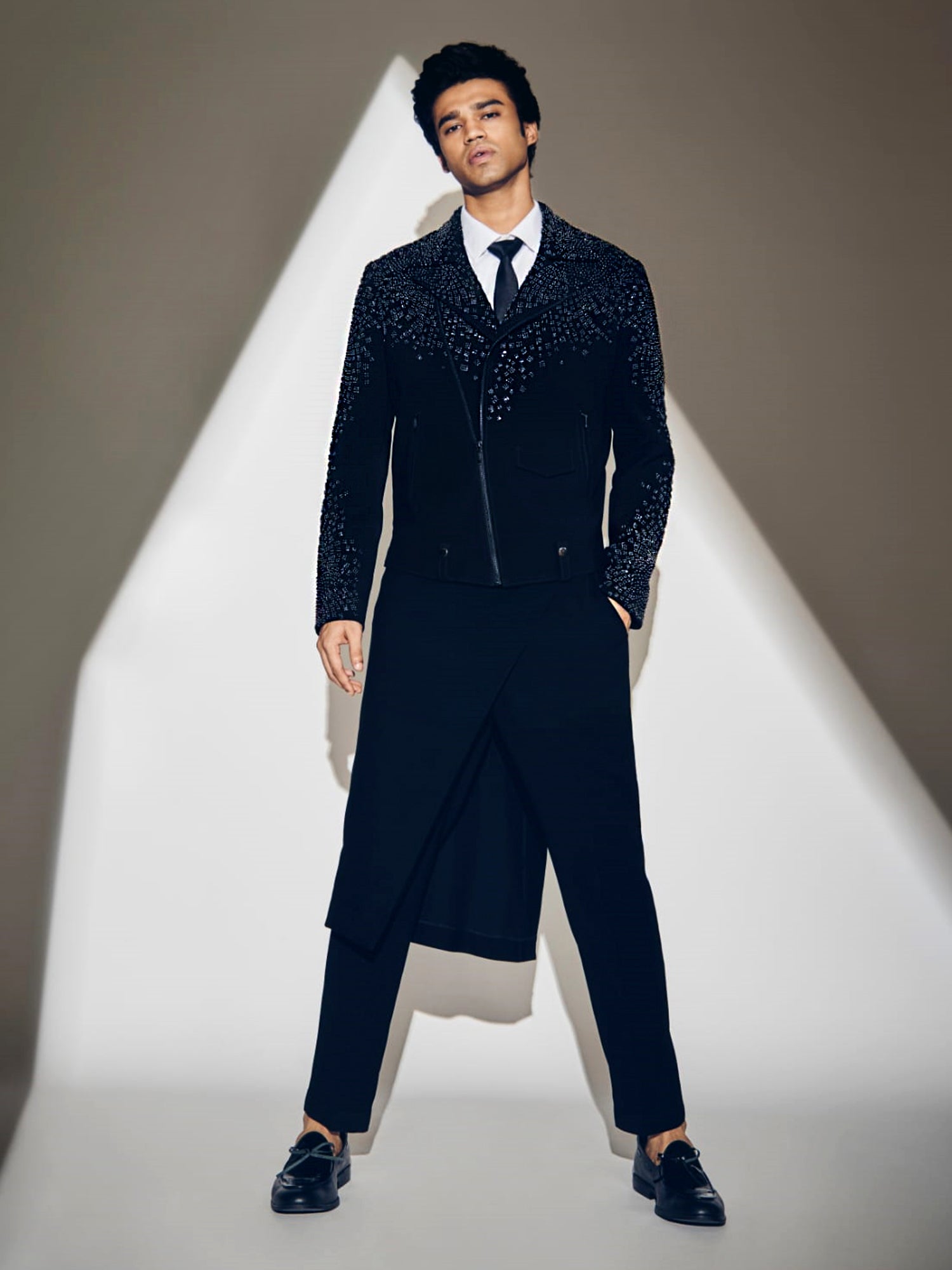 Our Jacket Has Fully Embroidered Lapel And Placement Embroidery Fully Filled With Black And Metallic Cut Beads And Hematite's.