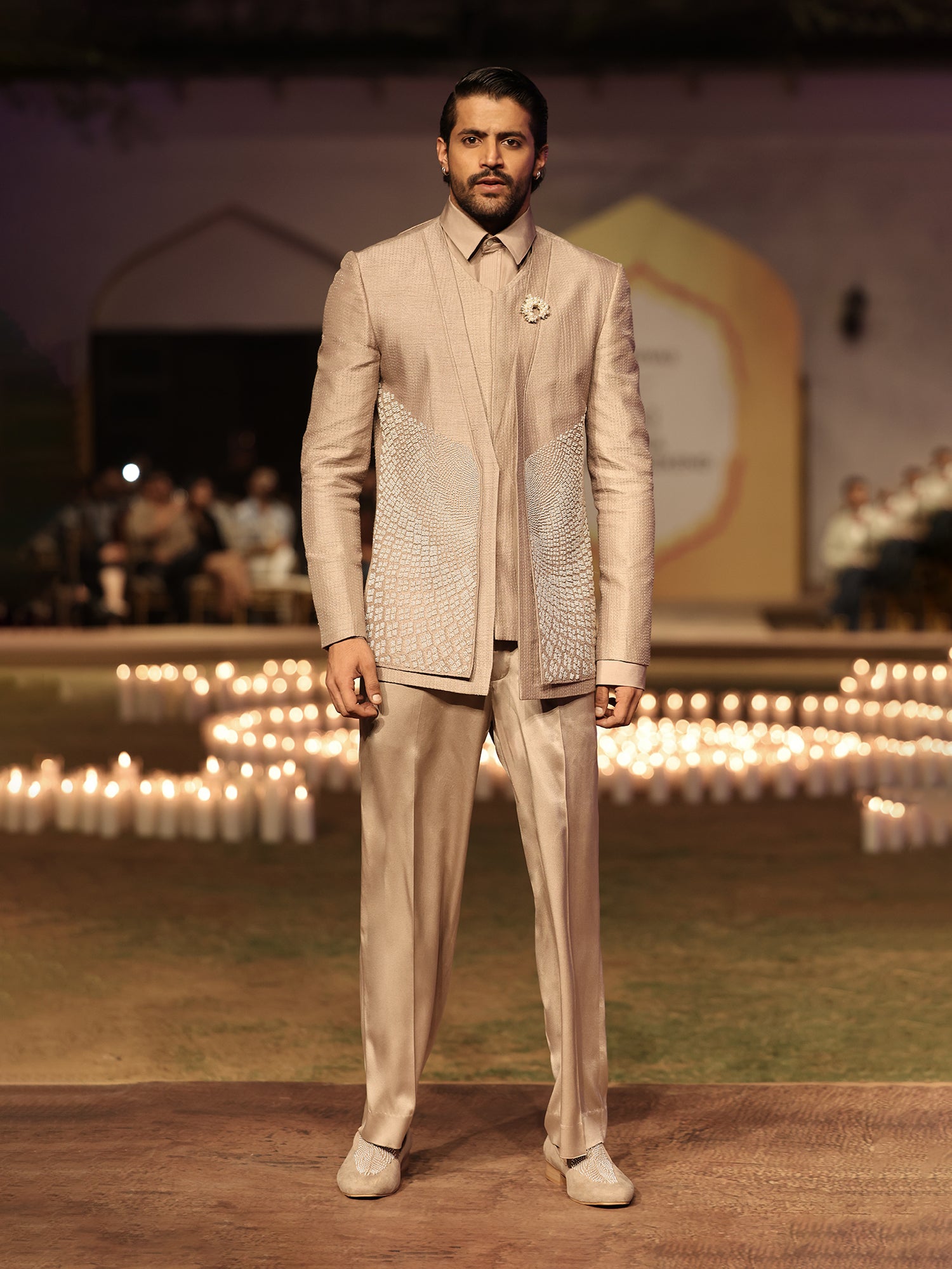 A refined and structured ensemble in a soft champagne hue, featuring an asymmetrically paneled jacket with intricate embellishments cascading from the waist. Paired with tailored satin trousers and a statement brooch, this look blends traditional elegance with contemporary sophistication.