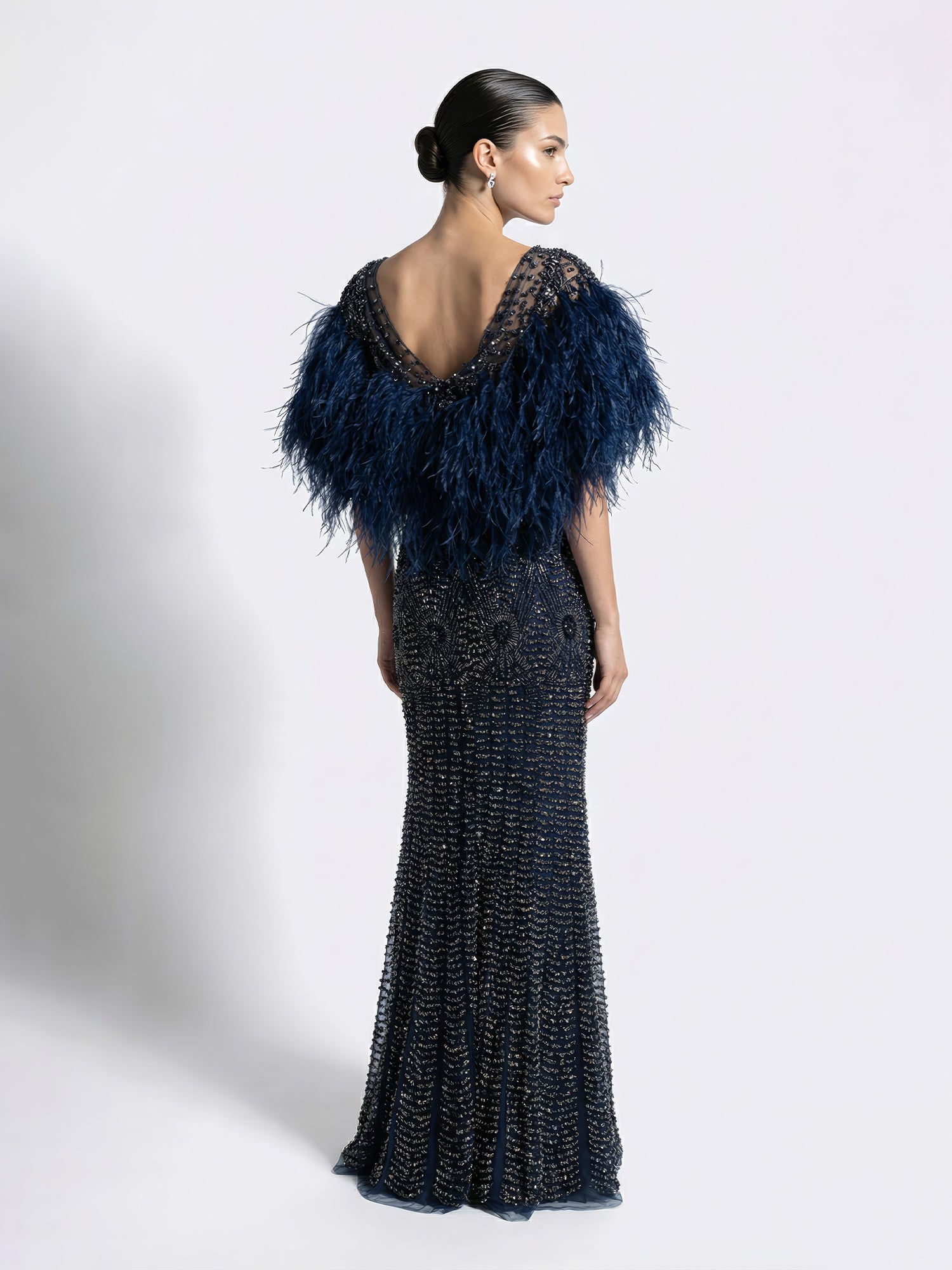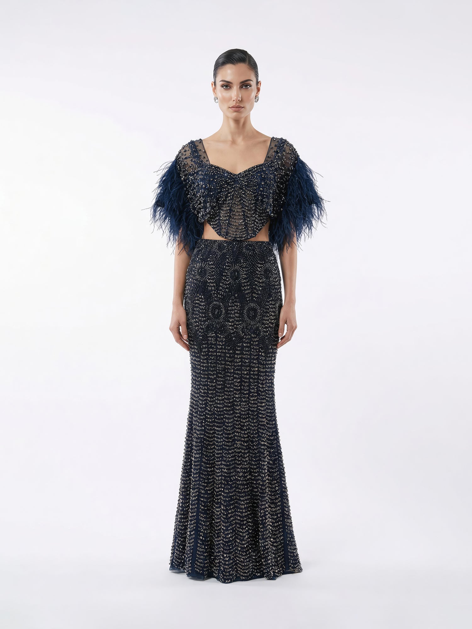 This mermaid-fit lehenga set features a sculpted corset that contours the body with precision and structure. The silhouette is detailed with linear scalloped stripes and delicate floral motifs, intricately embellished with uncut stones, crystals, and bugle beads in tonal metallic hues for a refined, luminous finish. Paired with a cape, the outfit brings movement and drama to its sculpted form, balancing strength with softness.
