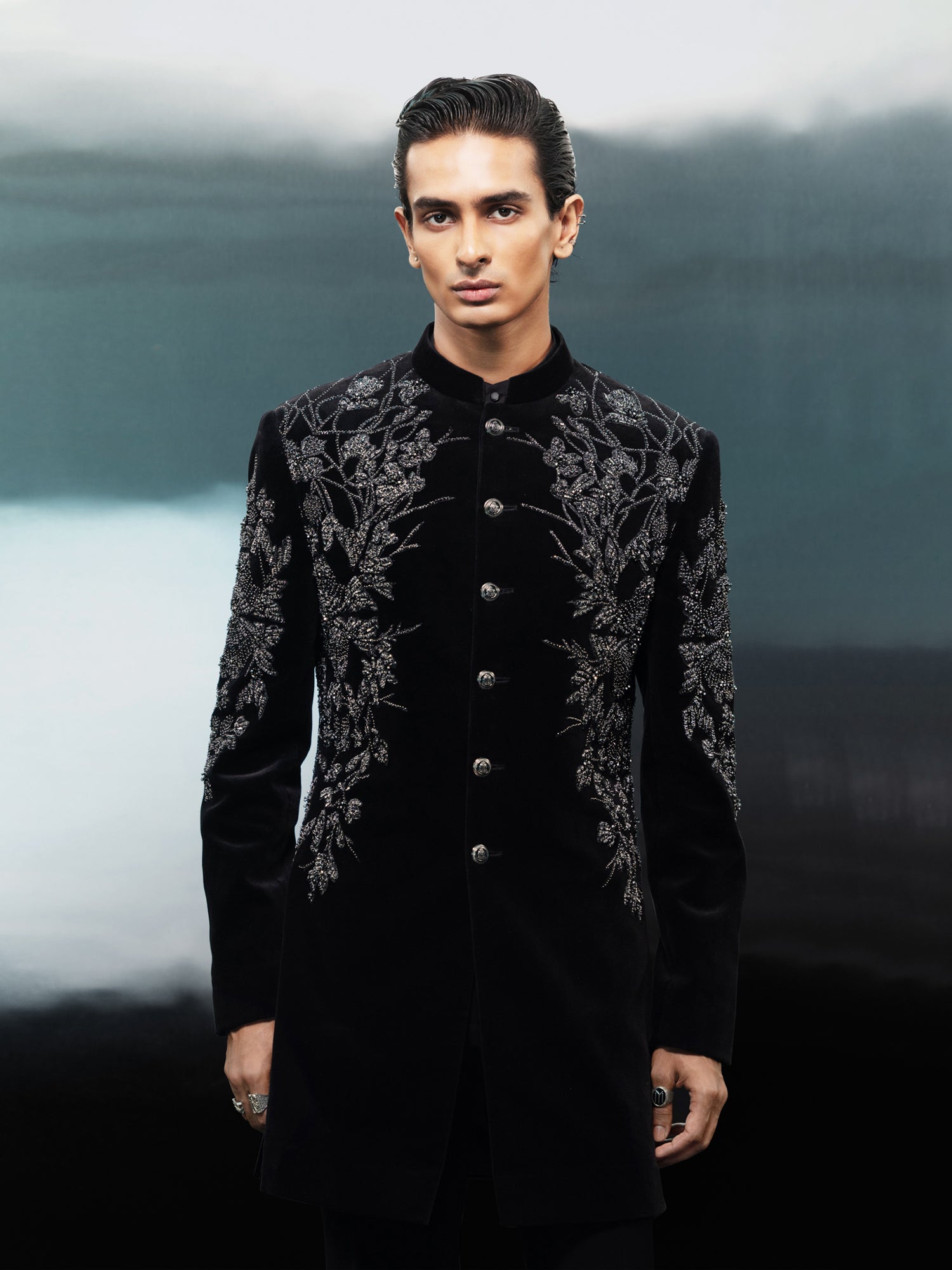 A regal black velvet sherwani adorned with exquisite silver thread embroidery in botanical motifs along the front and sleeves. The full-length silhouette features a structured bandhgala collar and traditional button fastening, blending timeless elegance with contemporary sophistication. Perfect for weddings, receptions, and grand celebrations, this ensemble exudes royal charm and refined style.