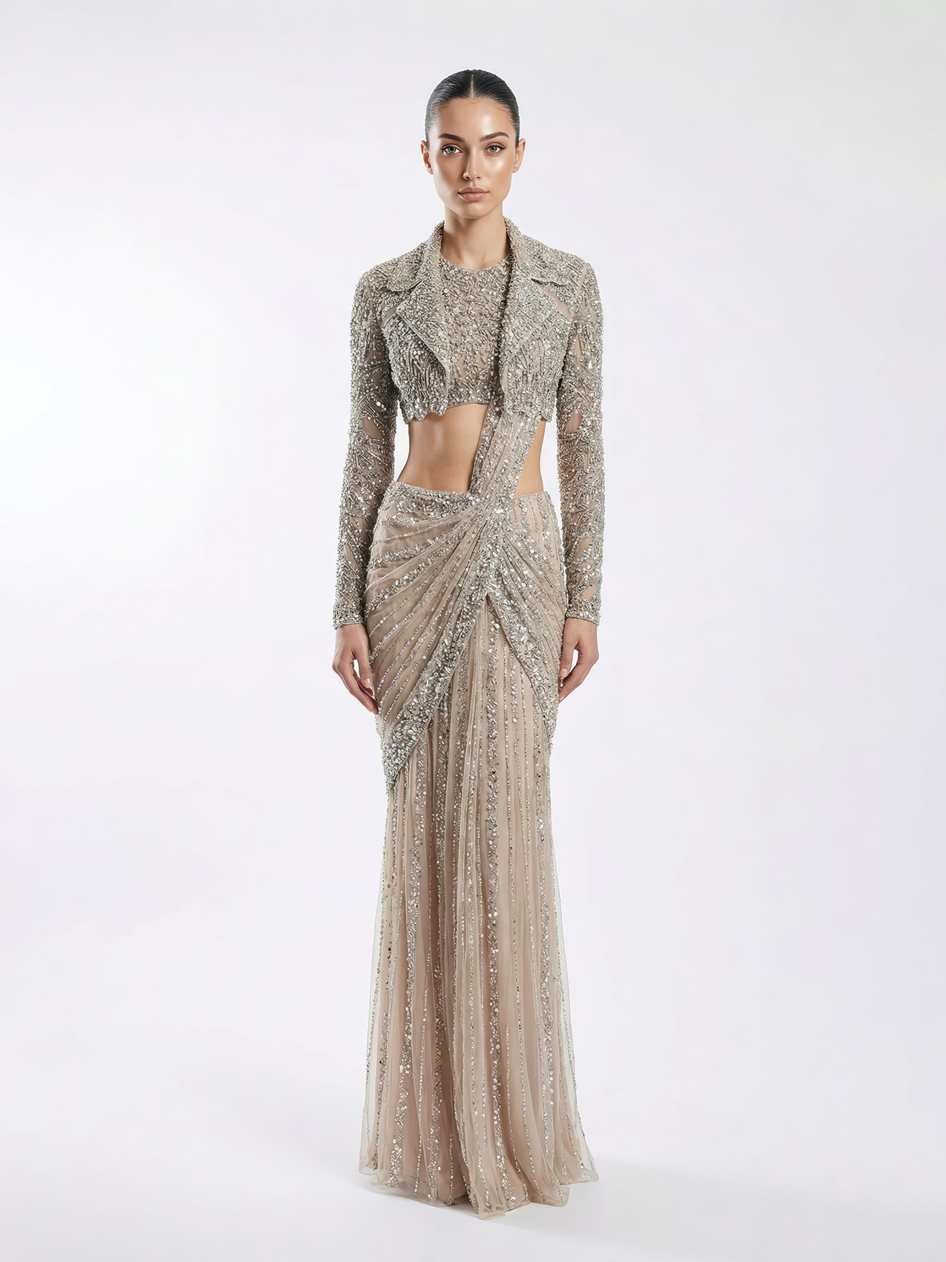 This statement jacket is adorned with dense encrustations of crystals, sequins, bugle beads, and uncut stones, creating a richly textured and luminous surface. The intricate detailing reflects light with subtle intensity, lending depth and dimension to the silhouette.