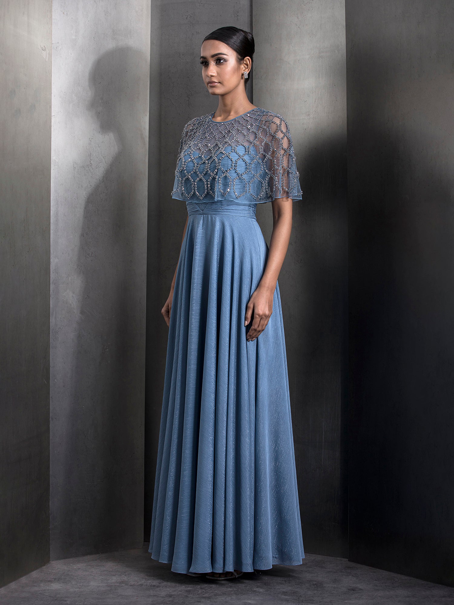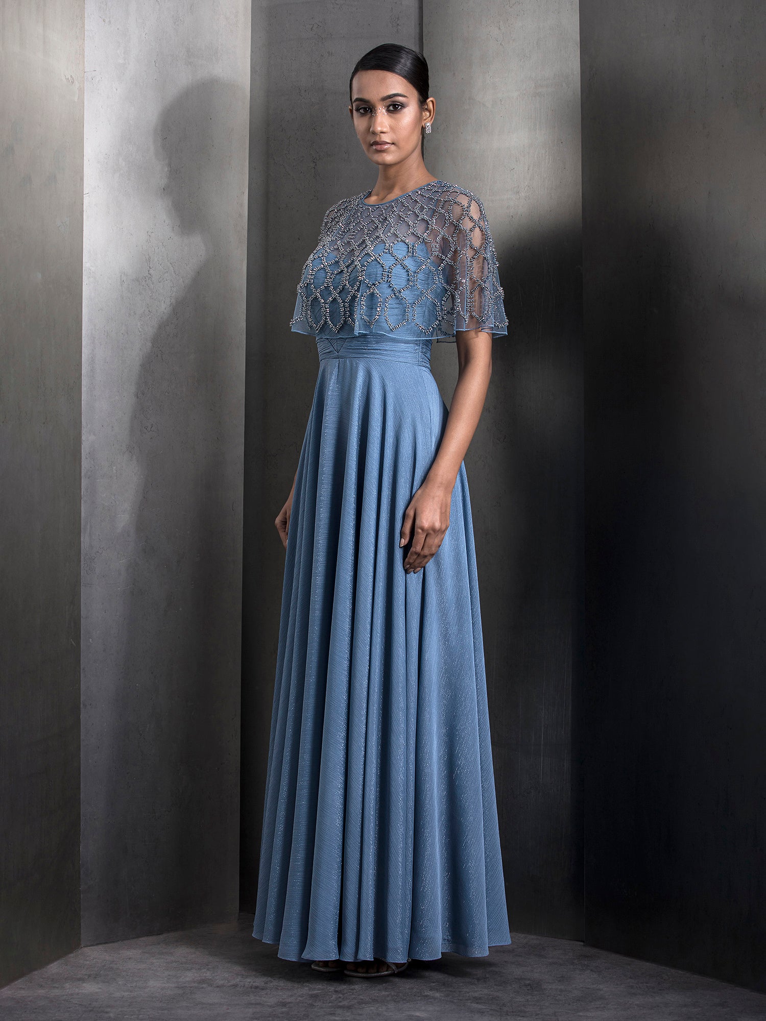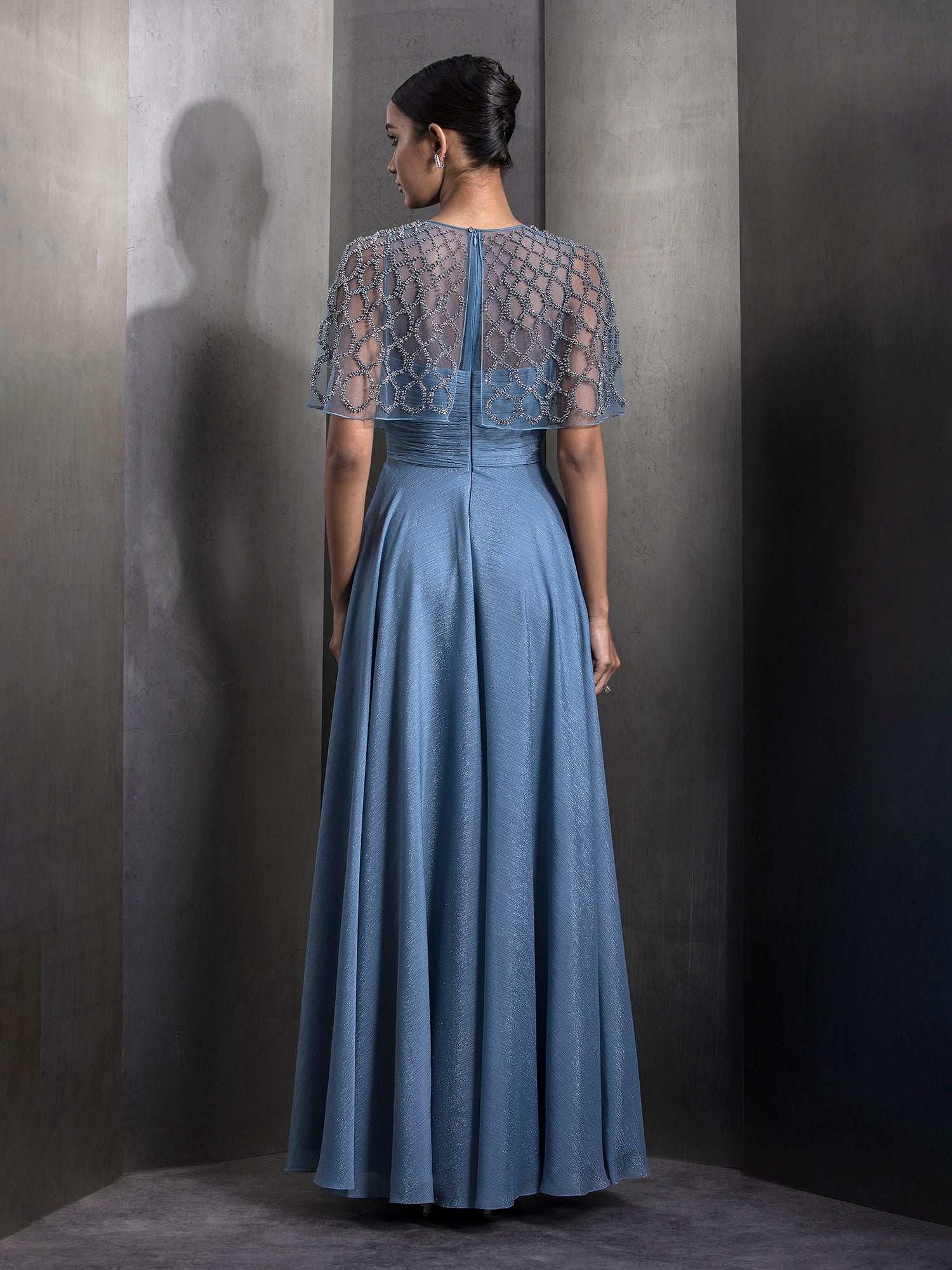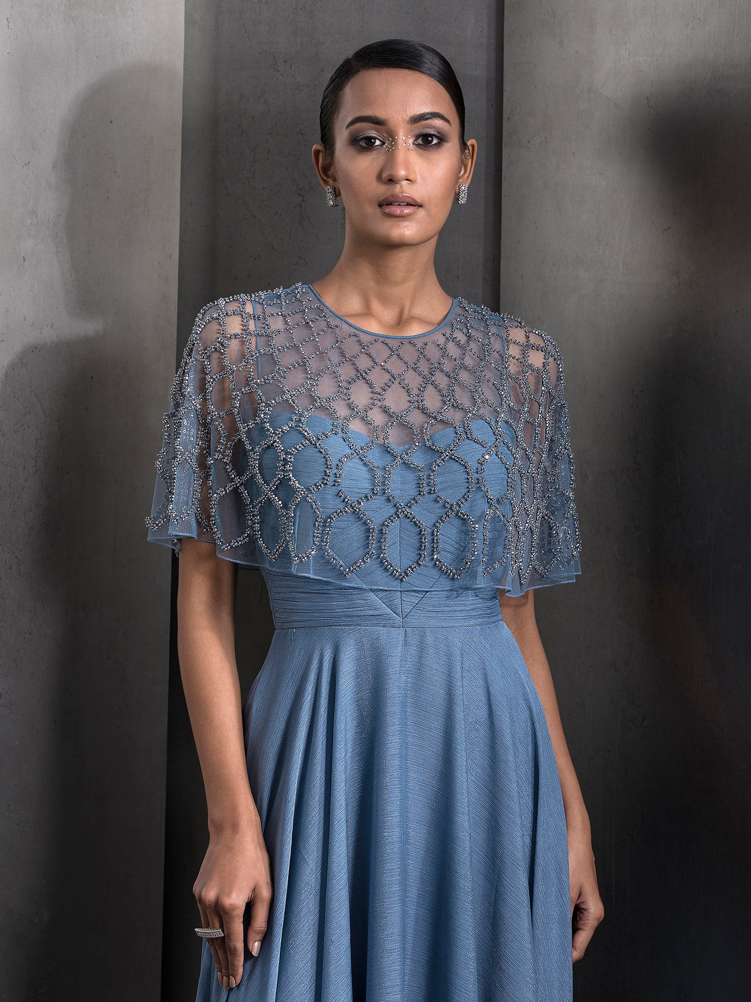 Our rhyolite kaftan in a shimmering Turkish blue stripe chiffon, features an attached silk tulle cape encysted with hematite's sequins and bugle beads.