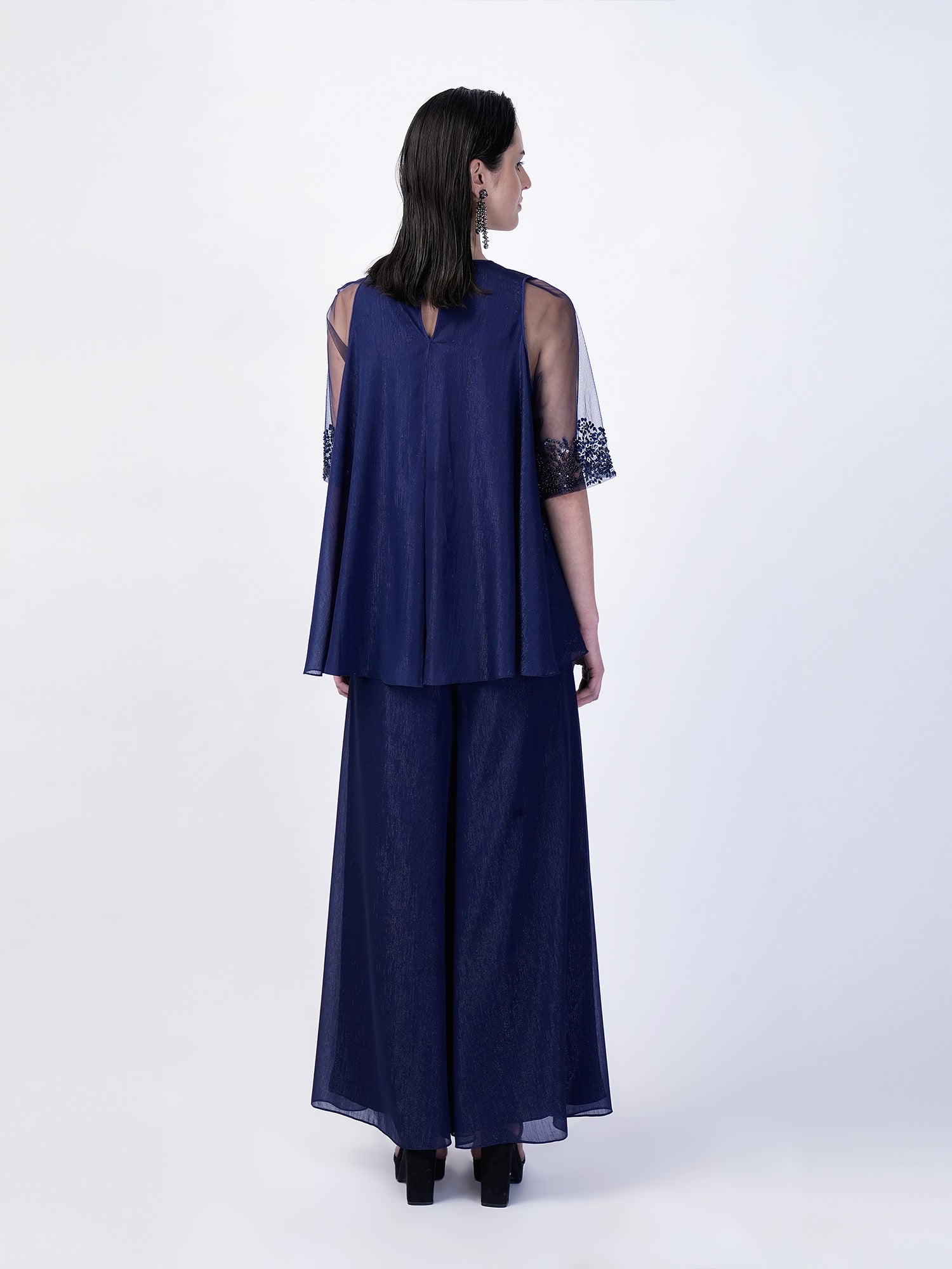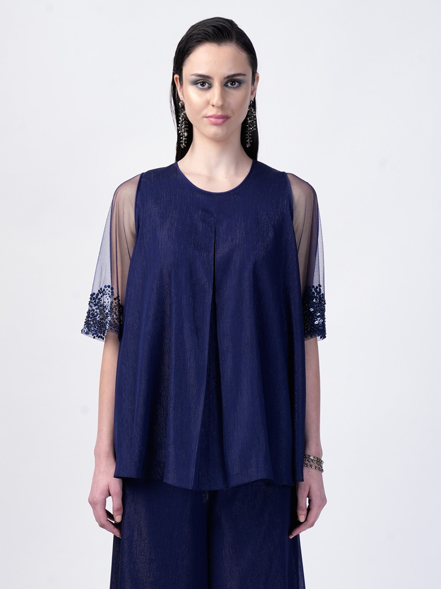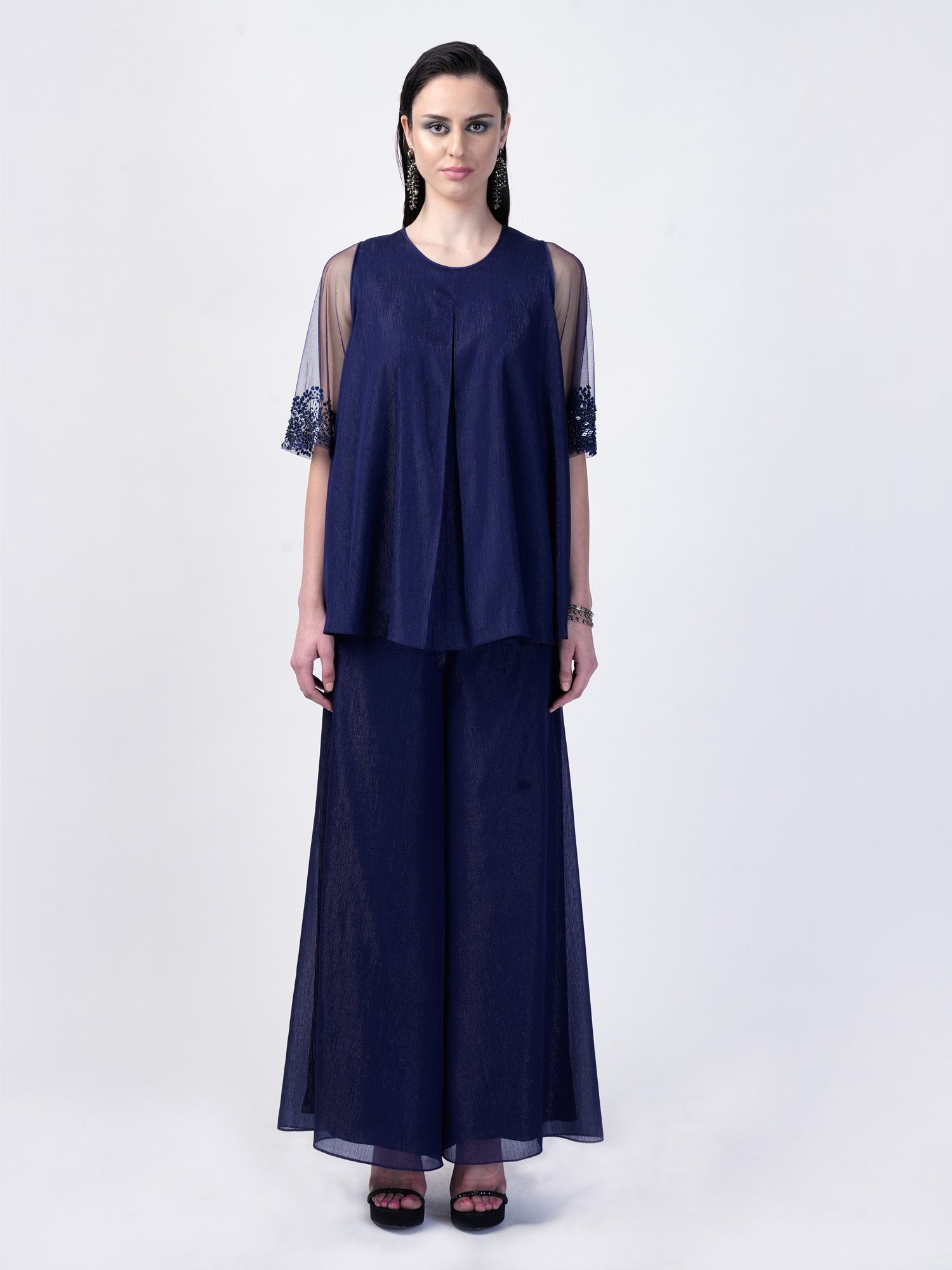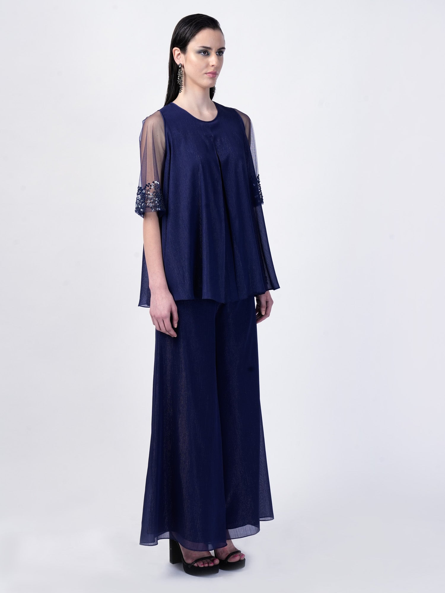The Swing top crafted from shimmering georgette fabric, featuring exquisite embellishments adorning the sleeves. Complete the ensemble with matching pants for a coordinated and chic look.