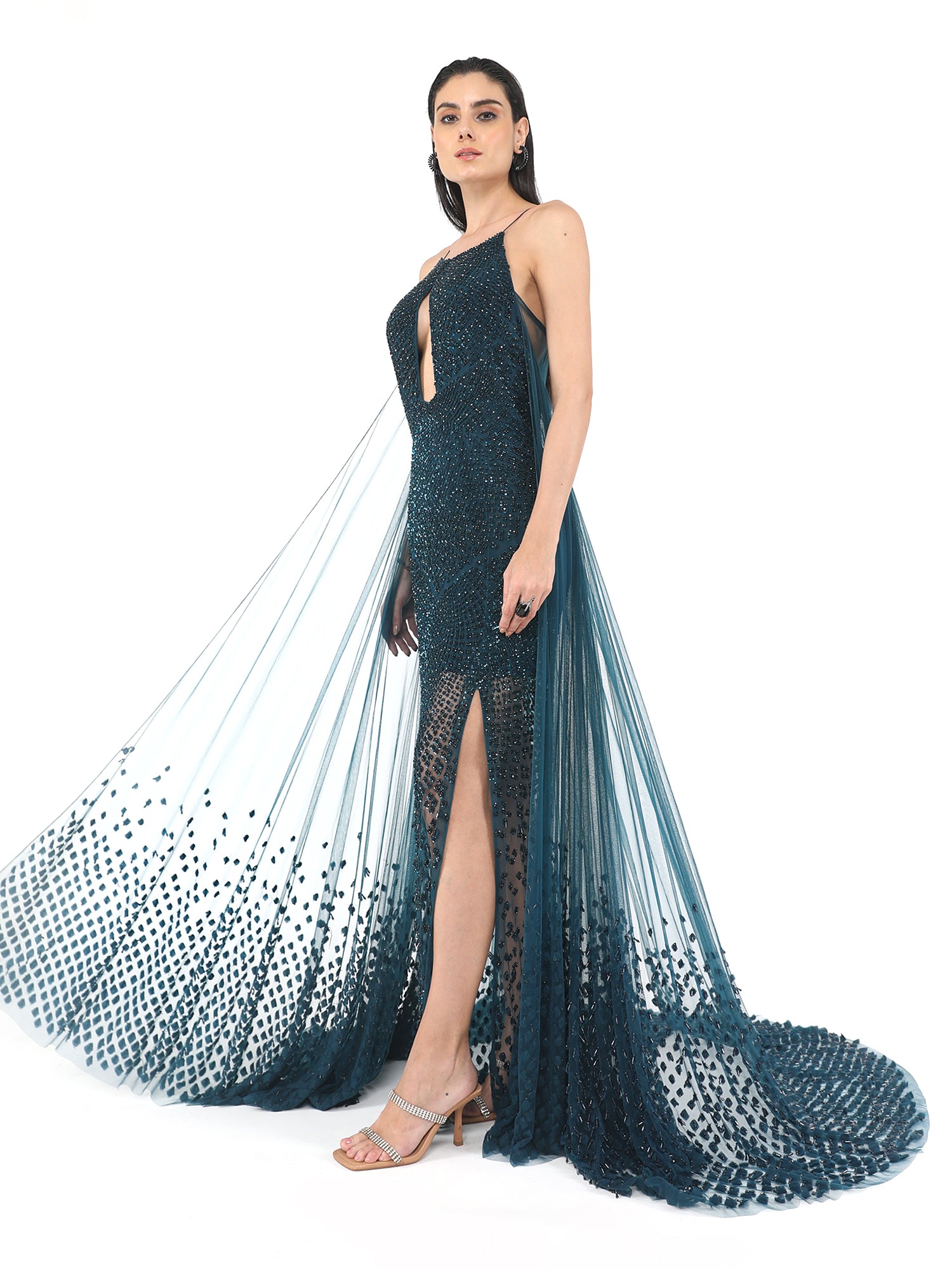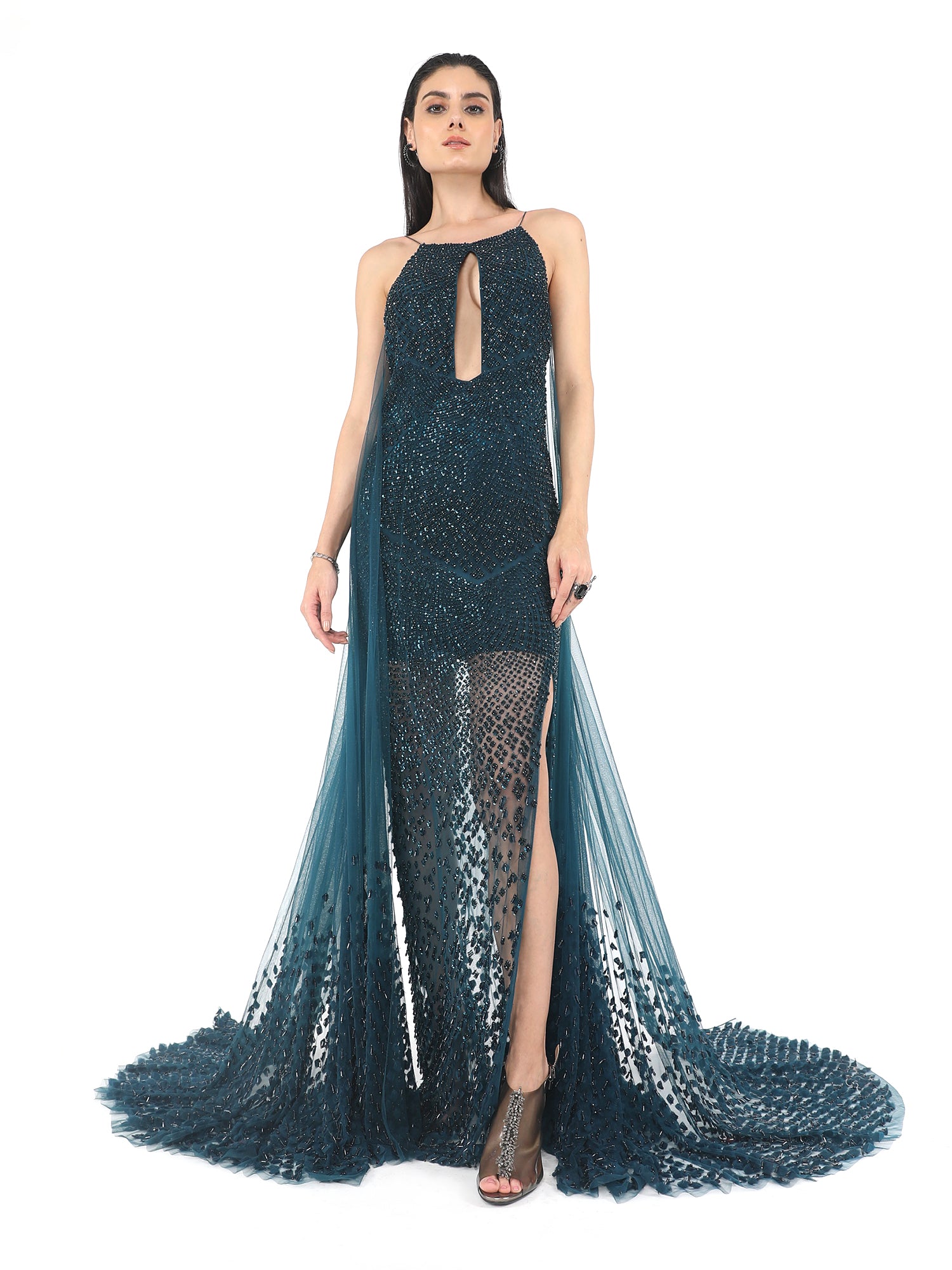 Our Starly Halter Neck Crystal Gown With A Slit Fully Embroidered With A Long Embellished Trail.