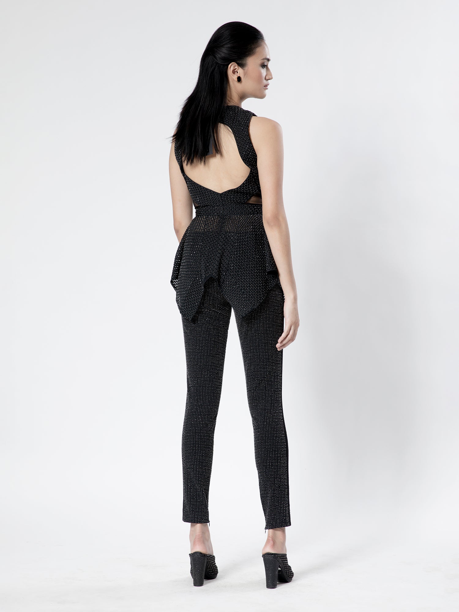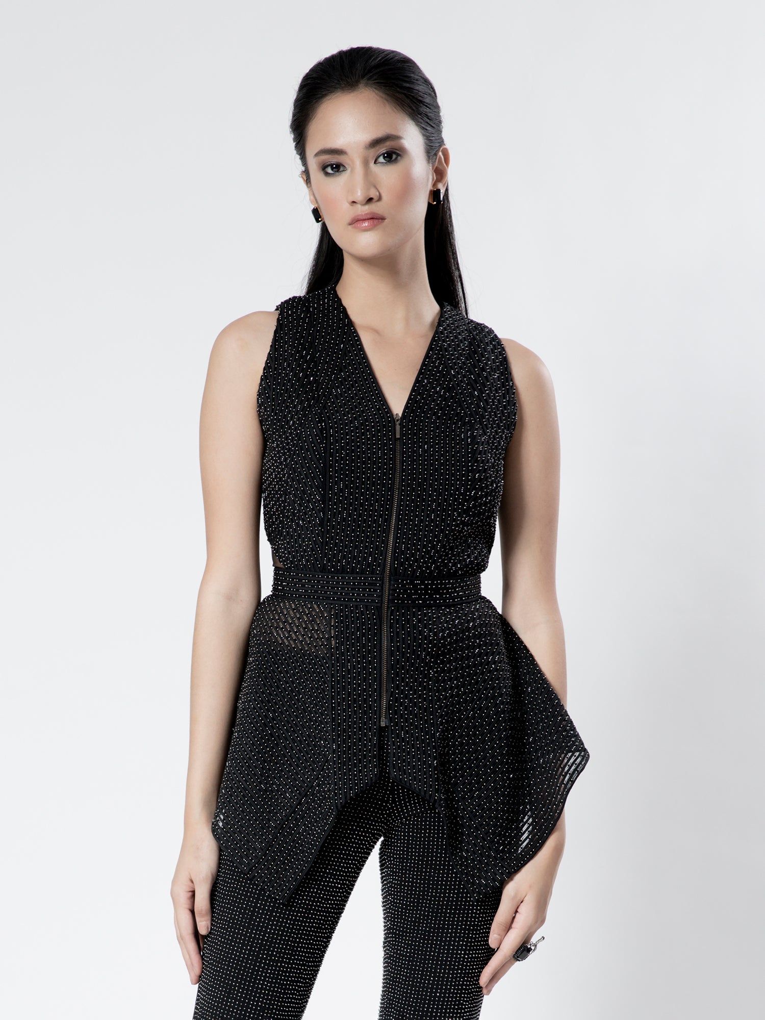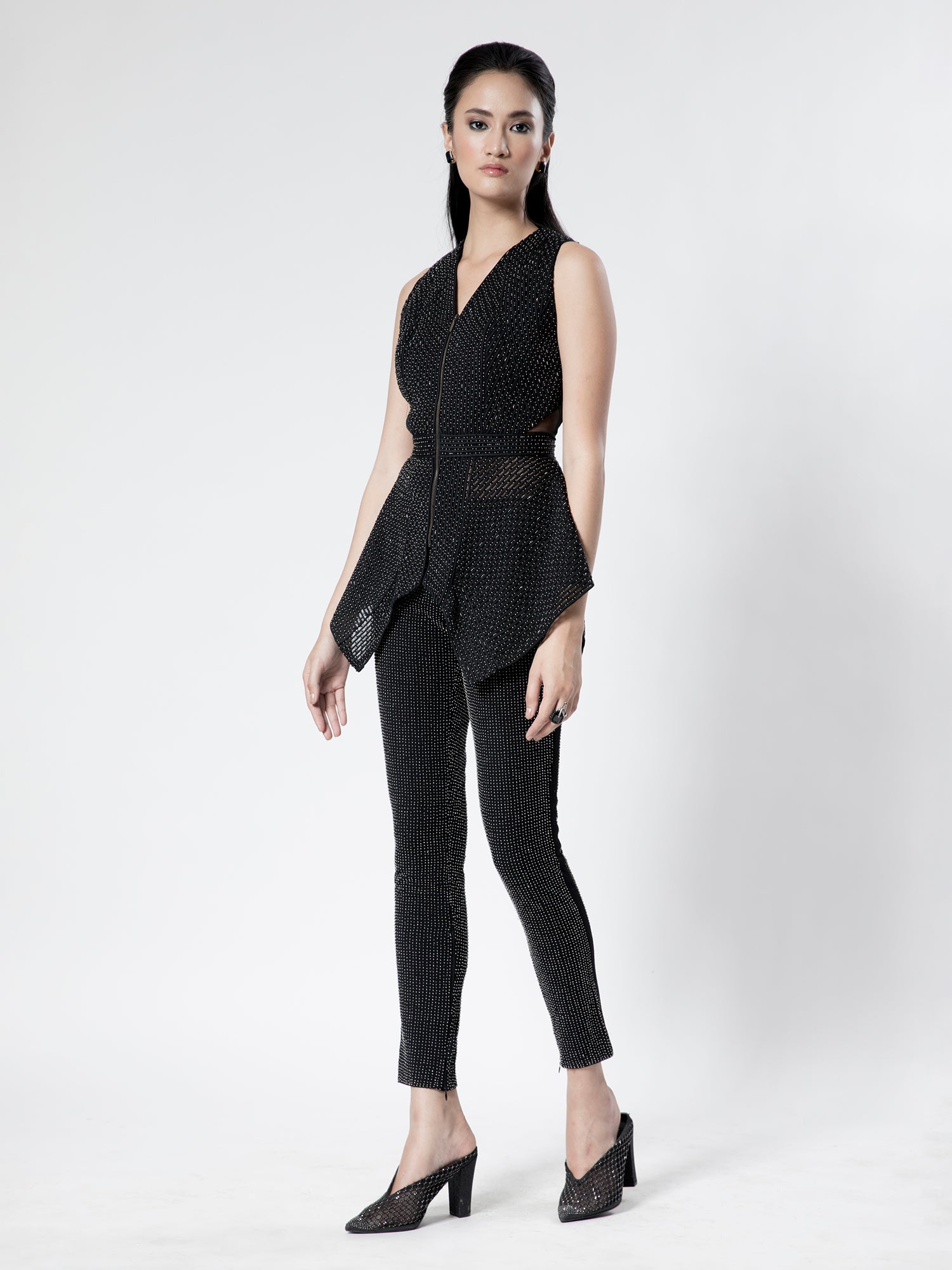 Our handcrafted asymmetric halter neck jacket with cut out details features stitched cords highlighted with crystal embellishment.