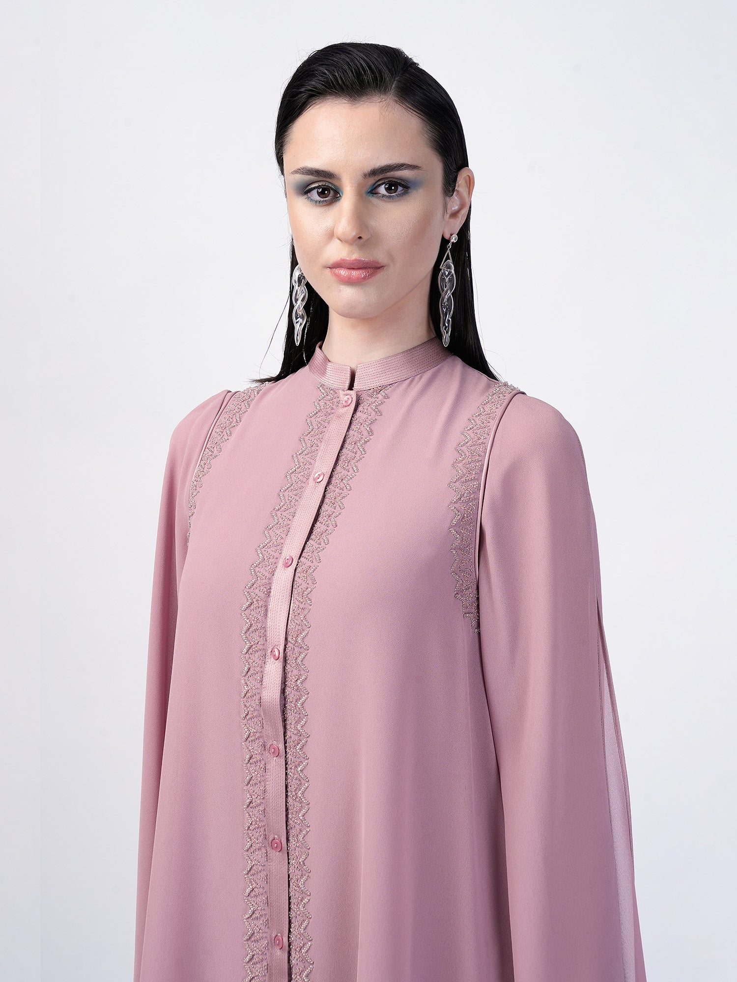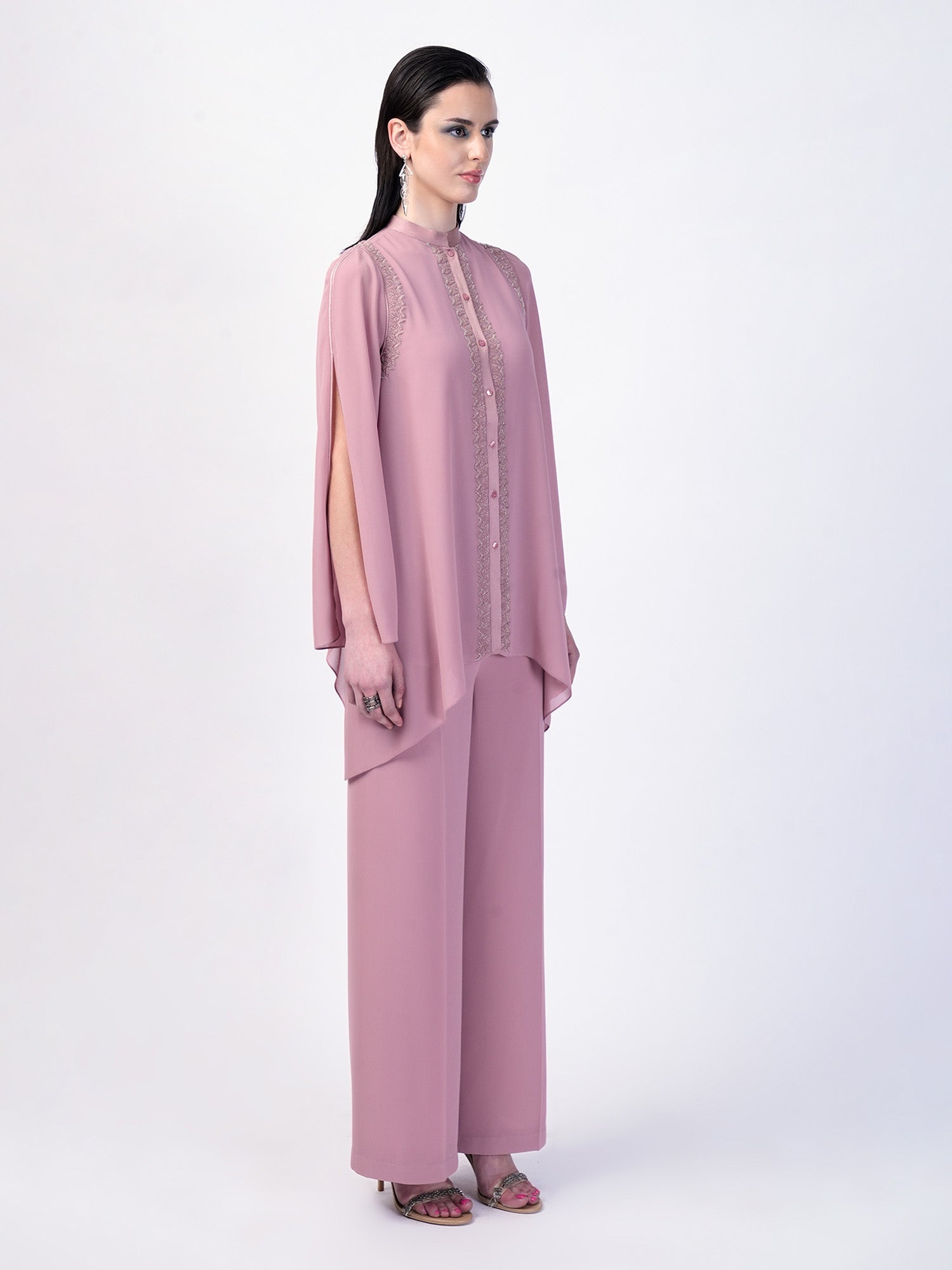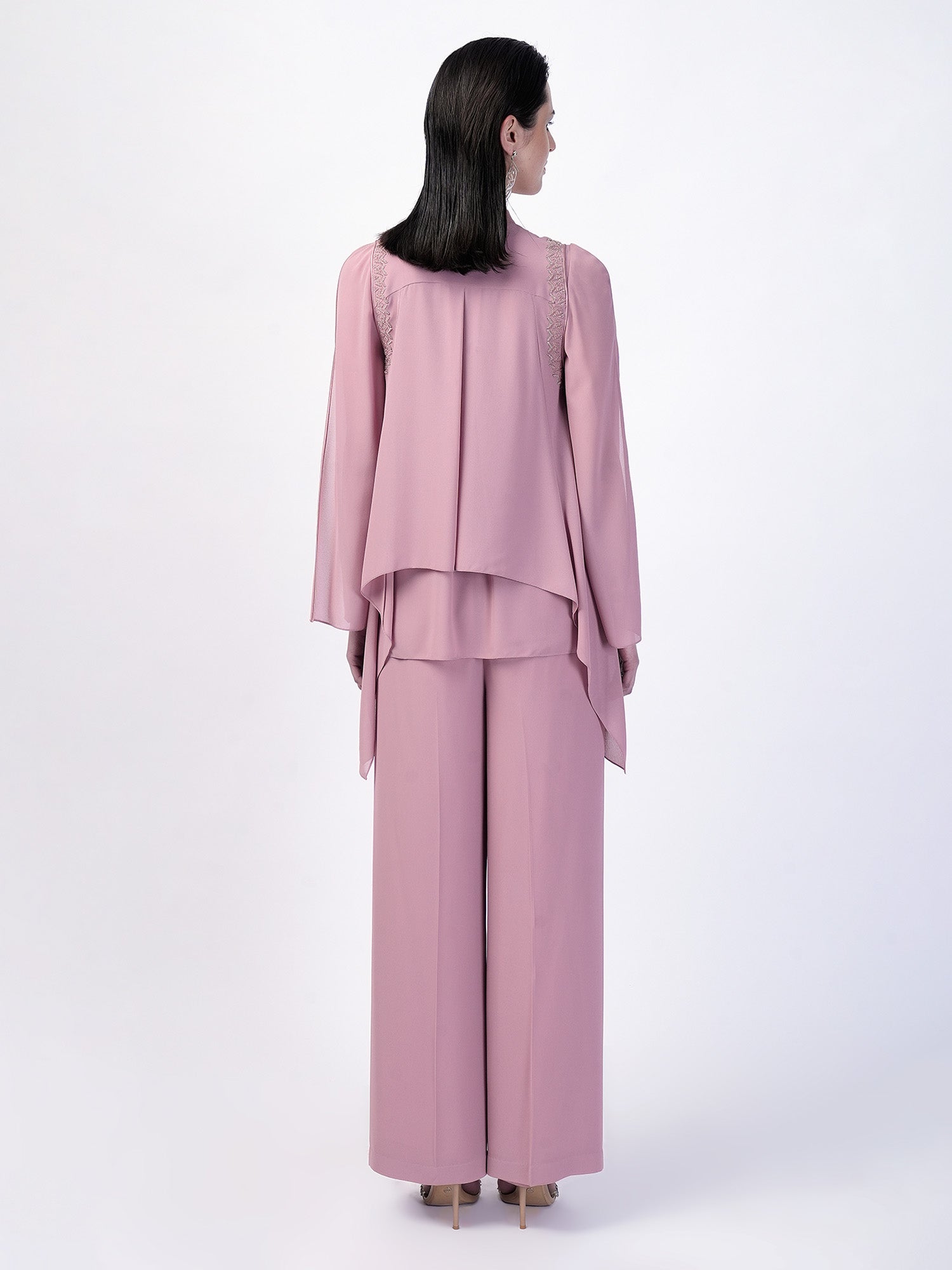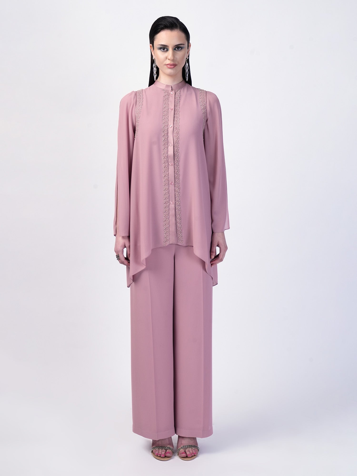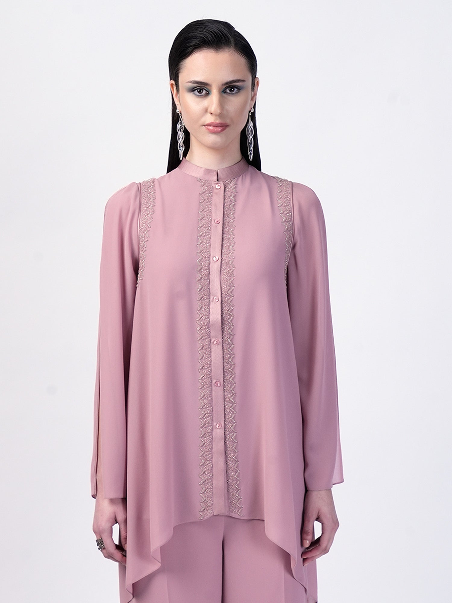 The Double layered handkerchief hem top luxuriously detailed with a silk satin collar and plackets, adorned with tonal glass beads and raised metallic sequences , this top is perfect for a casual chic outing.