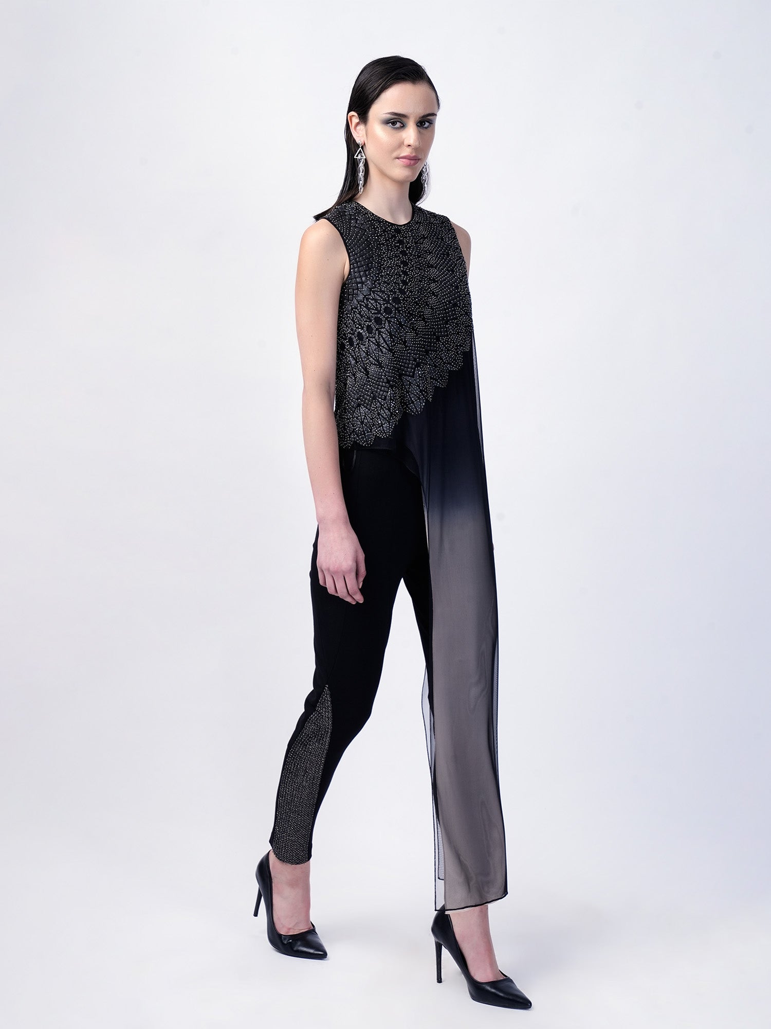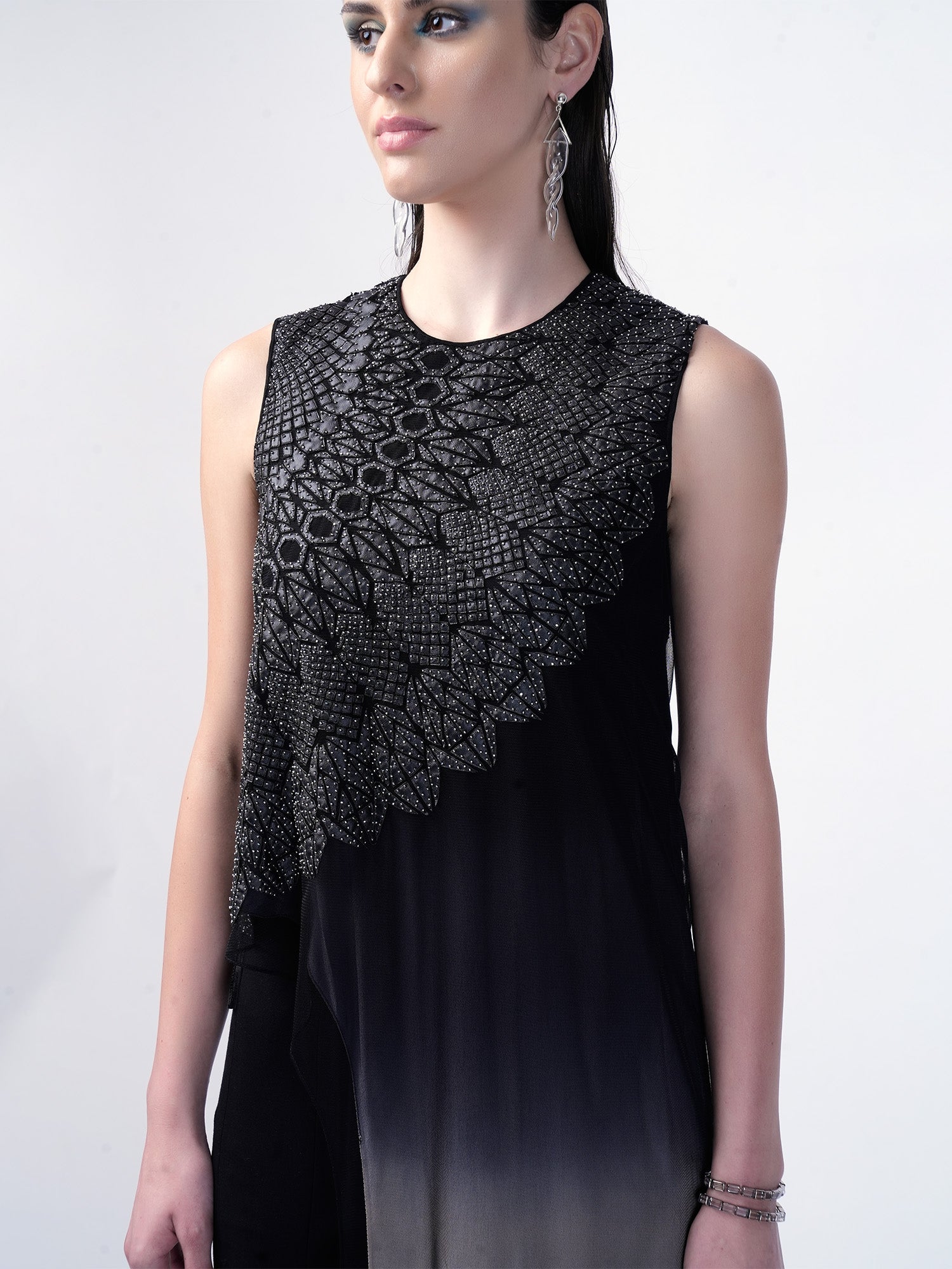 Asymmetrical Ombre top, crafted for your summer night gatherings. It's adorned with metallic sequins and beads, perfect for adding chicness to your outfit, it's ideal for those warm summer nights.