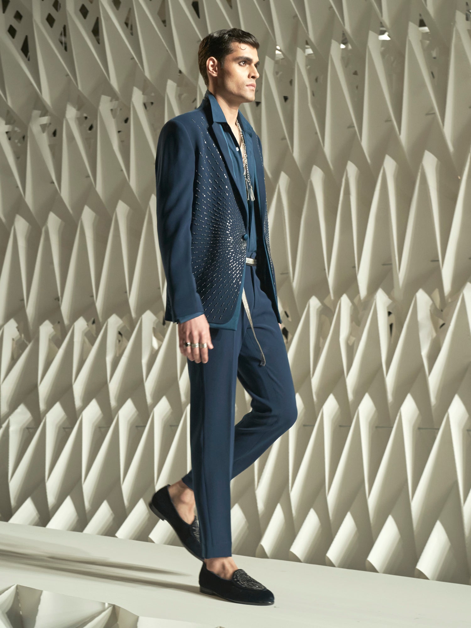 Our Ionic Jacket Has All Over Front Embellishment Of Glass And Metallic Crystals. Single-Buttoned With Satin Double Layered Satin Detail. With Our Classic Straight Fit Crepe Shirt.