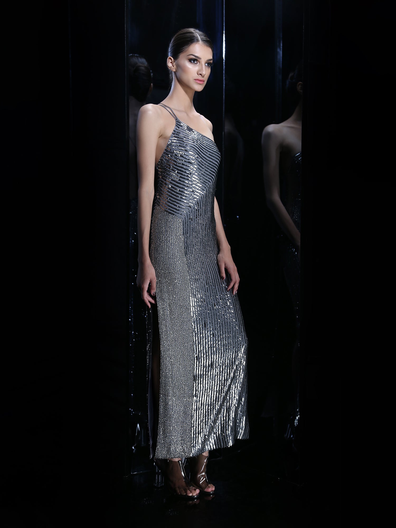 Step into the spotlight with this breathtaking one-shoulder silver couture gown, a masterpiece that blends modern glamour with timeless sophistication. Crafted with precision, the gown features hand-embellished vertical beadwork arranged in sculpted, wave-like lines that contour the body beautifully, creating a sleek and elongated silhouette.