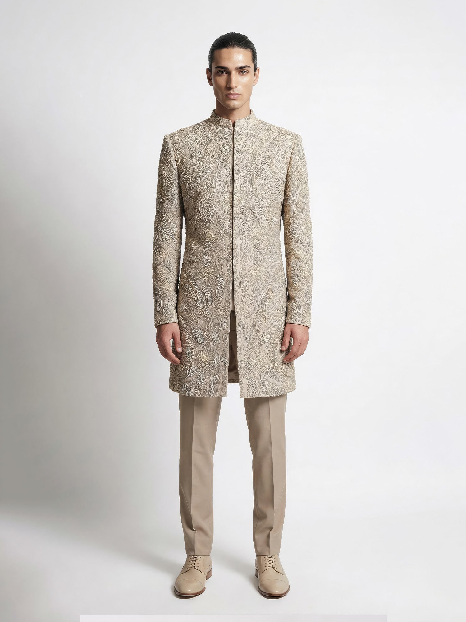Crafted in an elegant beige base, this sherwani is enriched with intricate tonal embroidery that flows organically across its surface. The elongated silhouette and structured bandhgala collar lend regal presence, while the restrained palette keeps the look distinctly modern. Designed with precision tailoring, it offers both refinement and visual depth without excess. Styled with tonal trousers, it is a timeless choice for ceremonial dressing — sophisticated, poised, and effortlessly commanding.