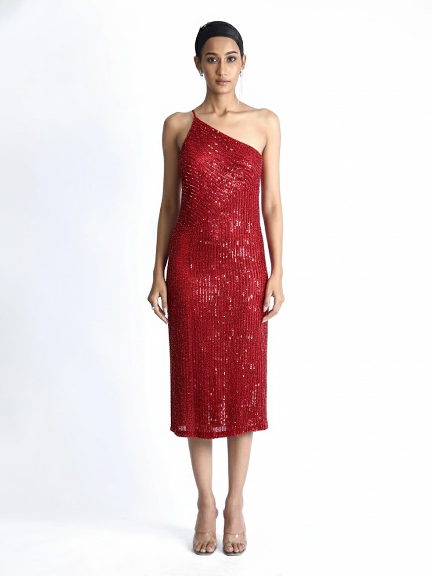 Crafted in a lustrous Emerald silk tulle, this one-shoulder long dress is encrusted with arrow sequins done all over.