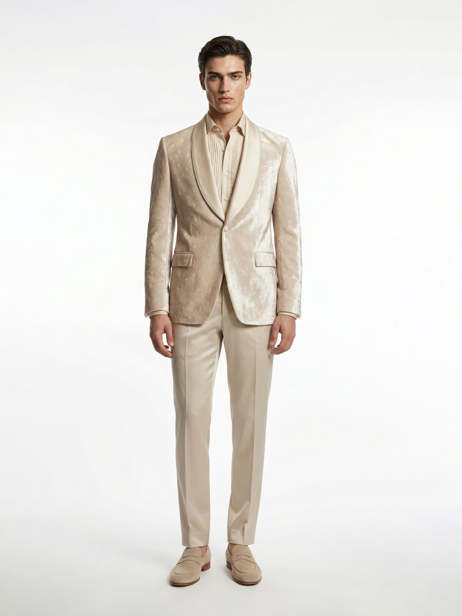 A silk velvet tuxedo featuring tessellated floral embroidery, meticulously hand-crafted in silk threads to create depth and quiet dimension across the surface. The intricate detailing lends a refined, regal luxe aesthetic while maintaining a sharp, modern structure.