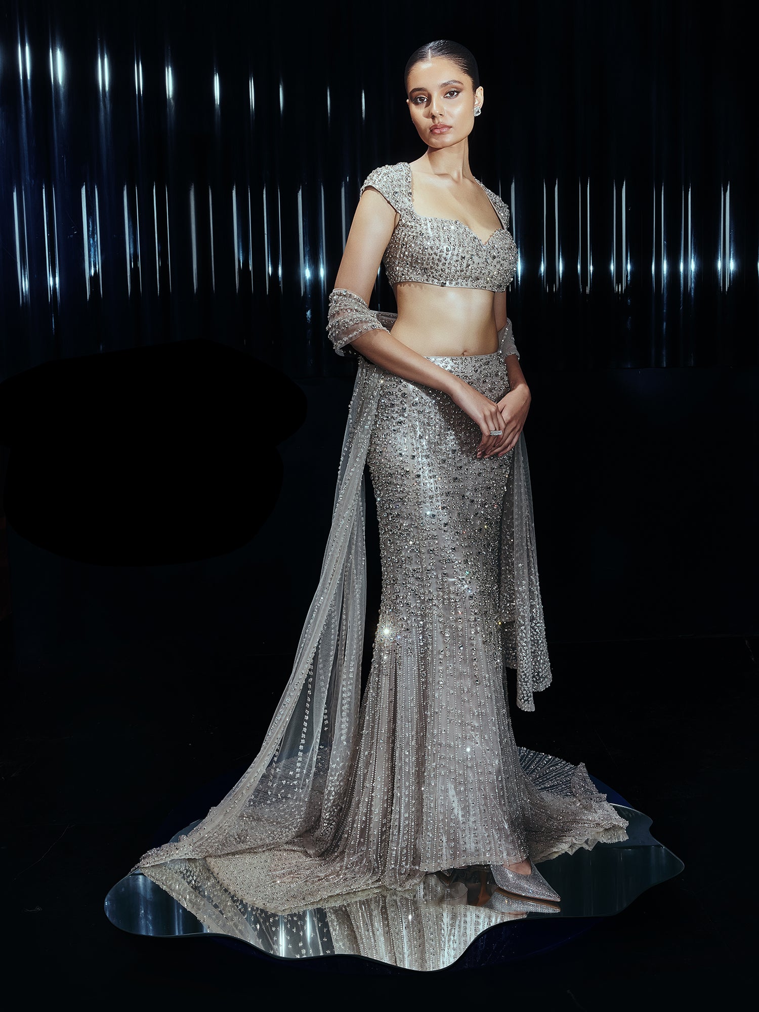 The intricately hand-beaded blouse features a romantic sweetheart neckline, sculpting the décolletage with feminine grace. Paired with a sleek silver fishtail lehenga that hugs the curves and flares into a dramatic finish, this ensemble is a perfect blend of old-world craftsmanship and contemporary silhouette. Radiant, refined, and unforgettable — Celestial Tide is made for modern royalty.